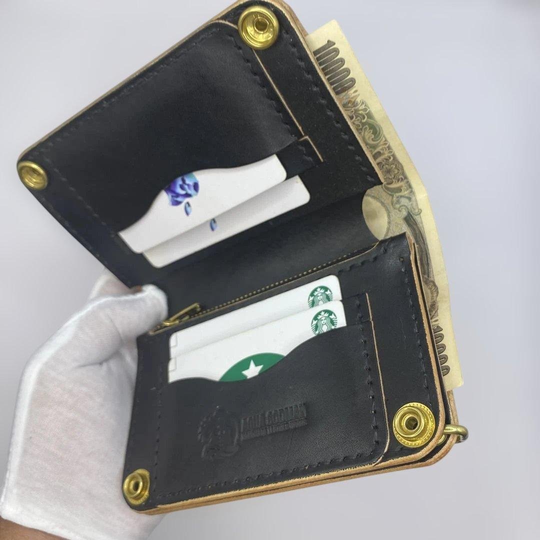 ※こちらは まるさんです。※ 画像は全てサンプル製品、参考画像です。【製品】トラッカーウォレット150(ミドル)3層 カスタム【皮革】カウレザー 茶芯ブラック【サイズ】縦93mm×横150mm×厚み20mm(全て手作業での切り出しの為、多少の誤差が出る場合があります。予めご了承ください。)【収納】ケース×1 札入れ×2 札押さえ×1 カードポケット×4【コバ仕上げ】無し【ステッチ】ブラック【金具】ニッケルシルバー【ジッパー】YKK(金具 ニッケル/生地 ブラック)※ 納期は2週間程になります。※天然皮革を使用している為、多少のシワ、キズ、シミ、汚れ等がある場合がございます。※金具の性質上、曇りや黒ずみ、錆、傷等がある場合がございます。特に真鍮生地は黒ずみや錆がよく見られます。予めご了承ください。※お使いのモニター設定、ご覧頂く環境によって実際の商品と色味、風合いが異なる場合がございます。※ 当方の出品している全ての商品はNCNRでお願いします。#レザークラフト#ハンドメイド#トラッカーウォレット#バイカーズウォレット#ロングウォレット#茶芯レザー#ステアハイド#ヌメ革#アメリカンチープ